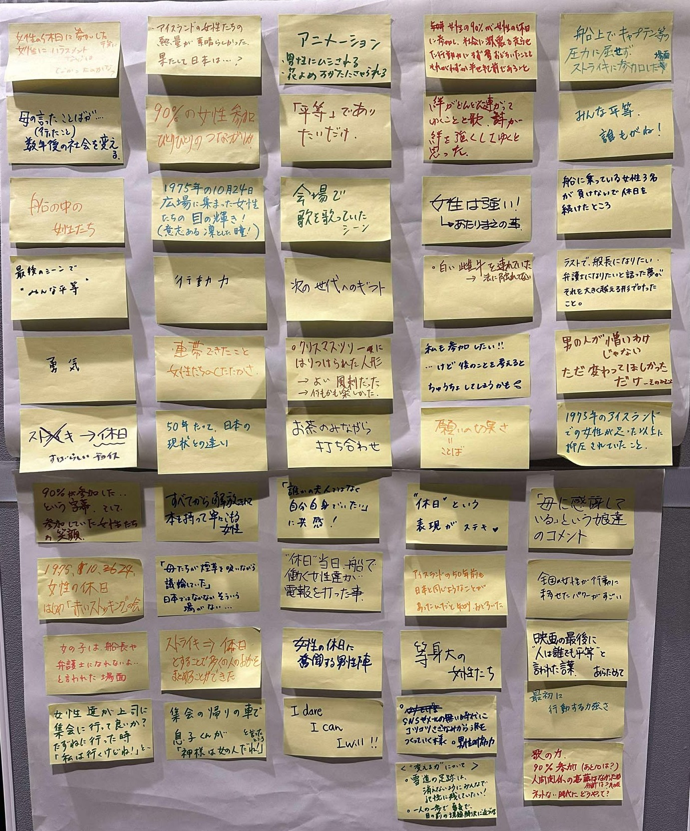 | 「女性の休日」をみて、印象に残っている部分がそれぞれ違うことも印象的でしたし、モヤモヤすること、それぞれの一歩も聴いていてうなずきがでるほど共感できることが多かったです。あらためて言葉で伝えること、対話することの重要性を感じました。 また、このイベントに参加したことが「私の一歩」につながっていると思いました。 |
